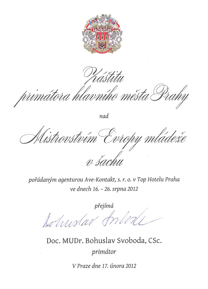 The European Youth Chess Championship 2012 is under the auspice of the Mayor of the City of Prague Bohuslav Svoboda.